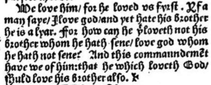 And this commandment have we of him: that he which loveth God / should love his brother also.” (MODERN SPELLING)