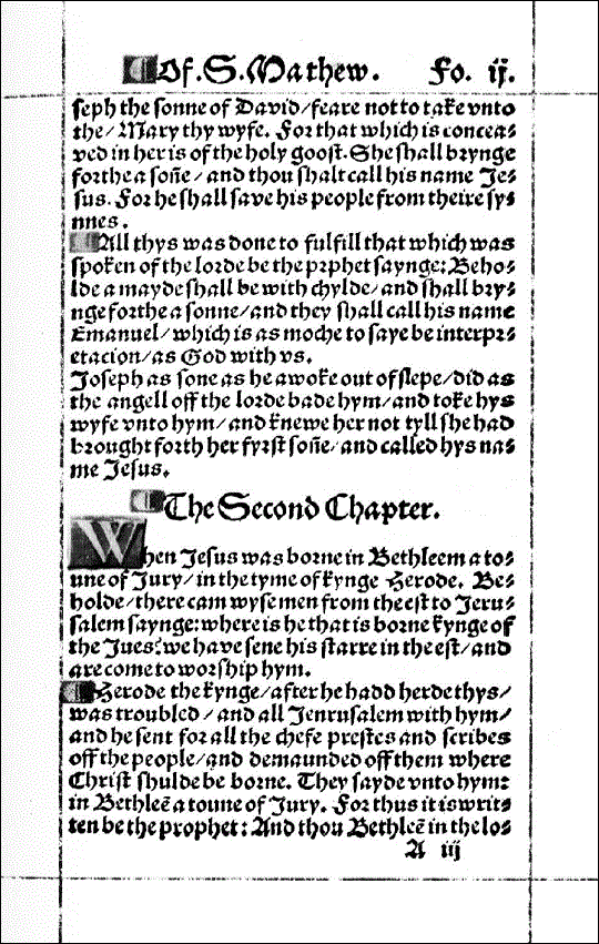 Listen to page 3 of the Tyndale New Testament published in the year of 1526. It is read by a computer synthesized voice. Page 3 is Matthew 1:20 to 2:6 and includes the portion of Scripture where the unborn Jesus is called Emmanuel.