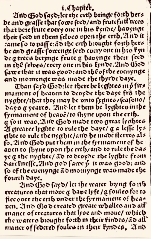 Tyndale’s Pentateuch, 1530 Genesis, Chapter 1 Share this: Click to share on X (Opens in new window) X Click to share on Facebook (Opens in new window) Facebook Like Loading...